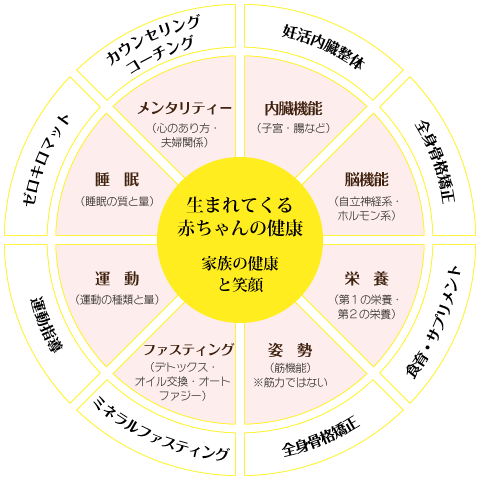 この8つの条件を妊活8バランスと呼び、このうち何が足りないのかをカウンセリング、医学的検査、科学的なボディチェックを通じて患者さまに理解してもらい、不足部分を補い、更に妊活8バランスを拡大していき妊娠体質を作っていきます。